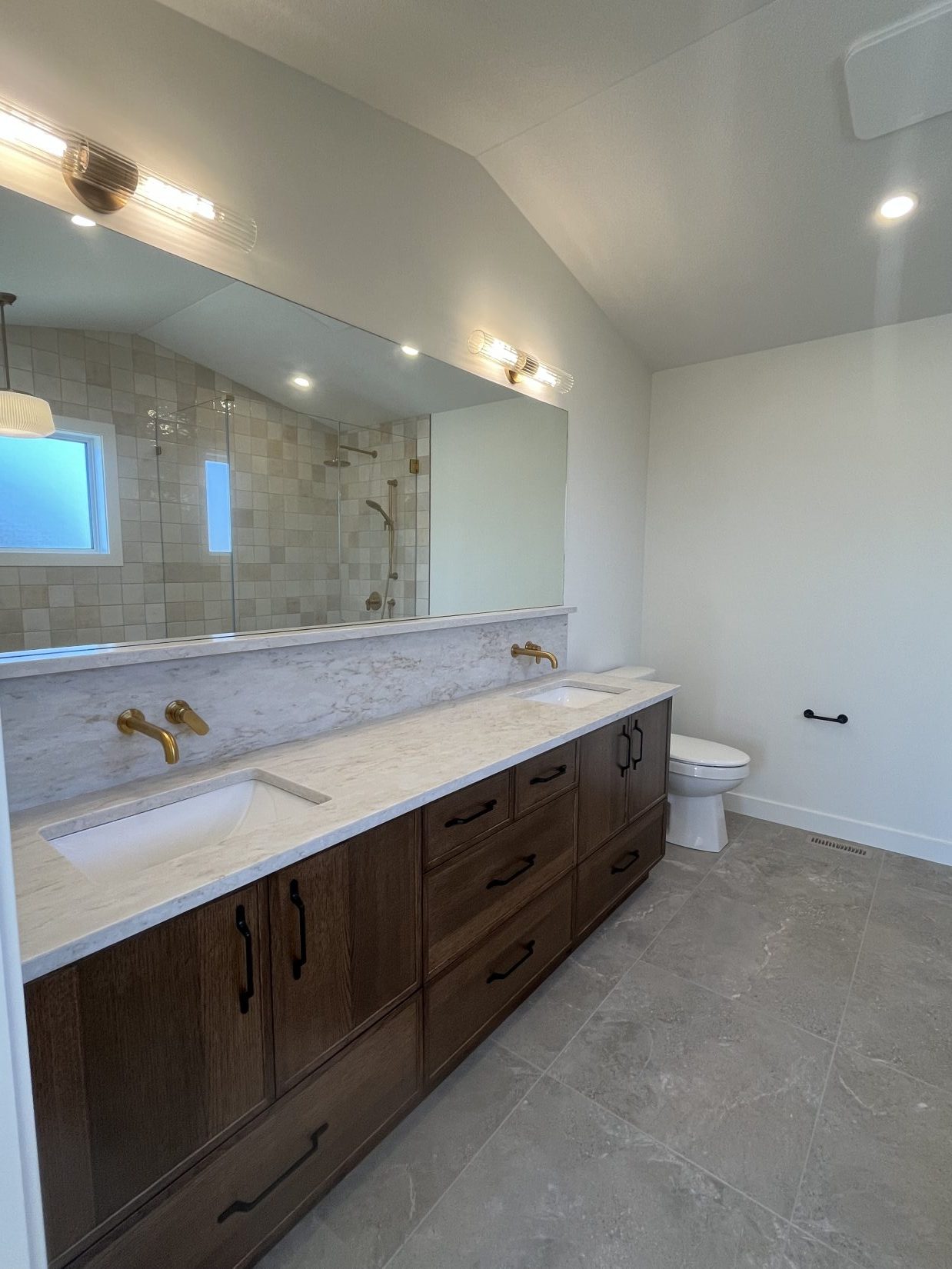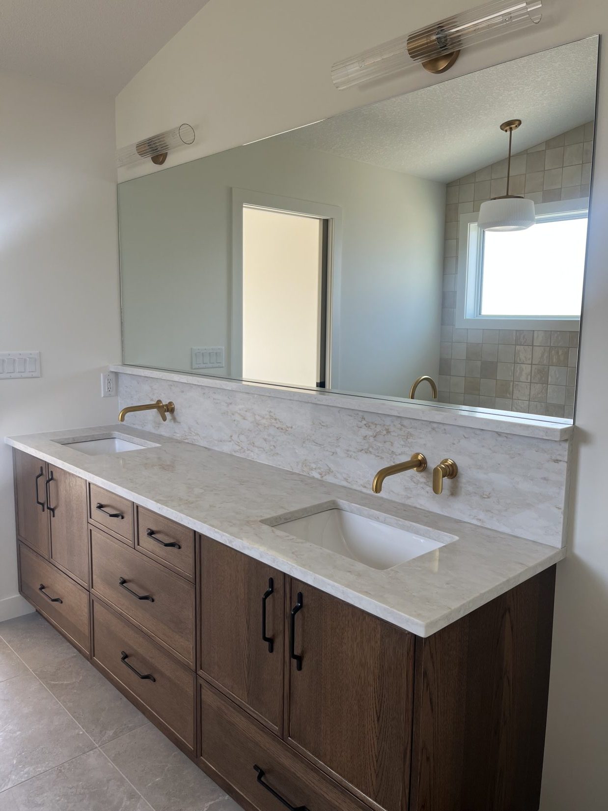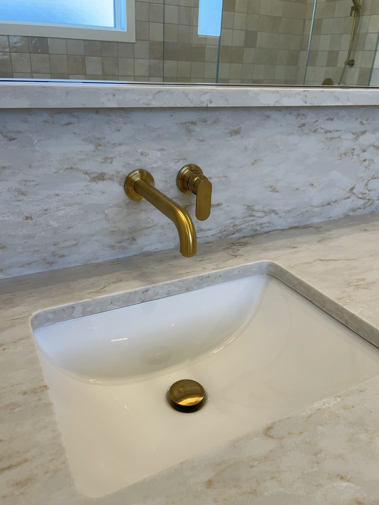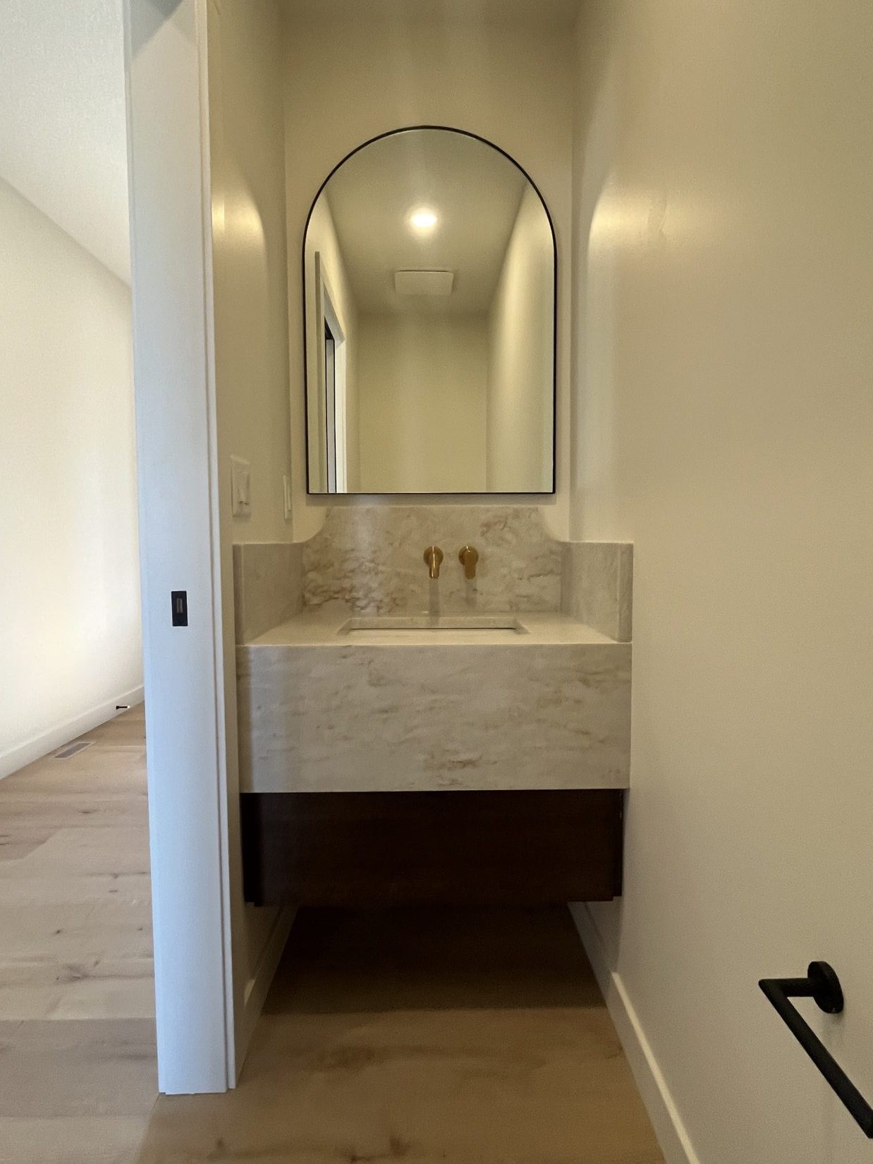 - Half bathroom floating vanity with quartz skirt & custom cut backsplash, custom mirror, and in-wall brushed brass faucet